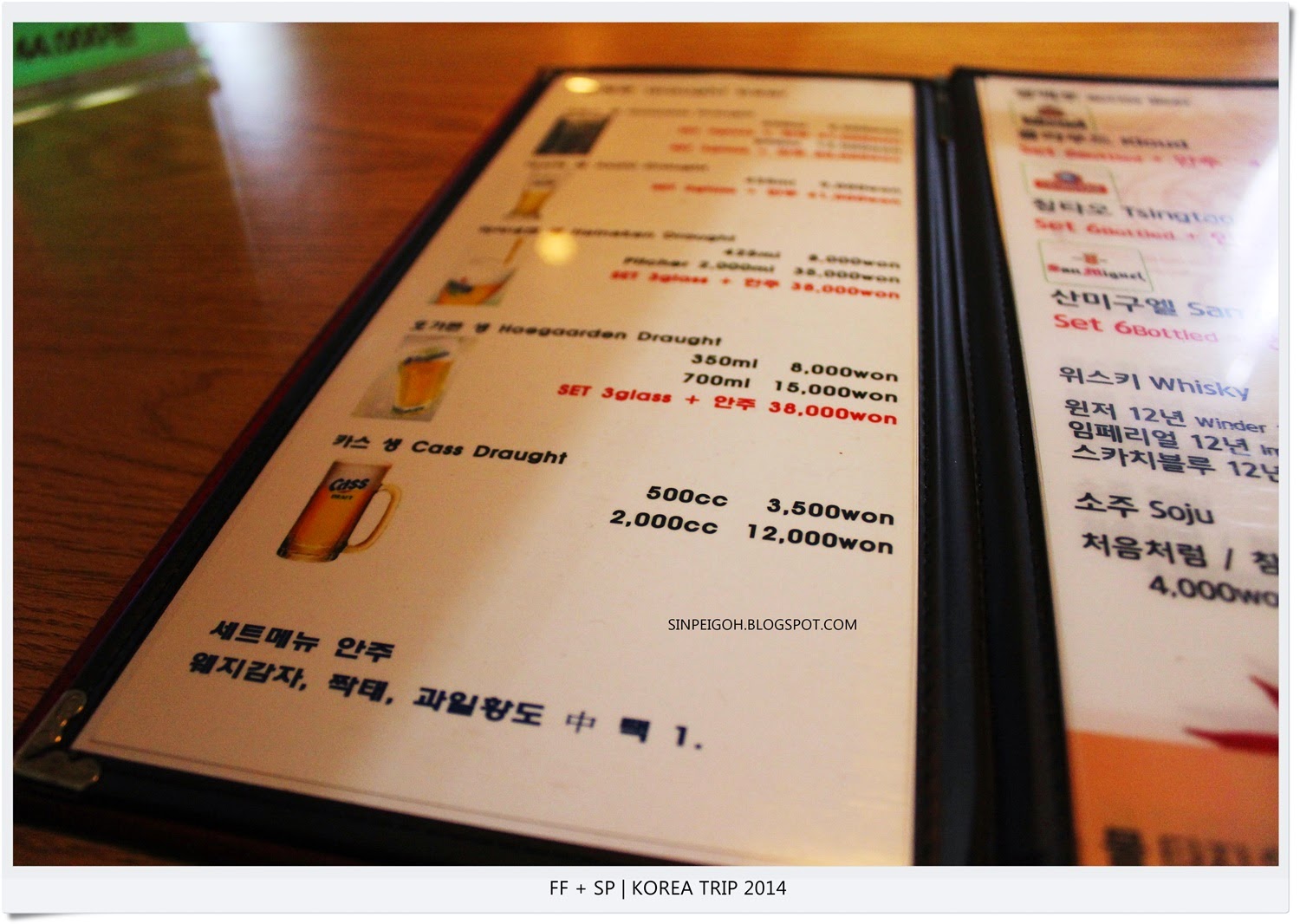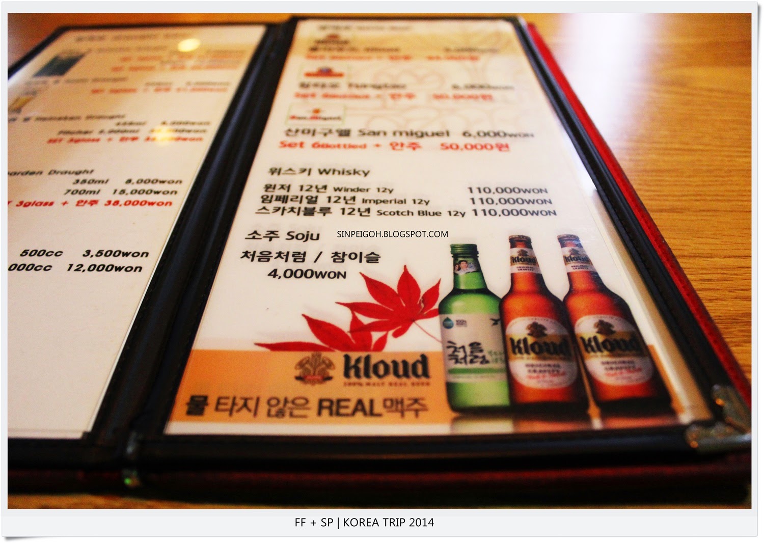 看了看menu我們也不知道要點什麼,就選了一杯500cc的韓國Cass啤酒和韓國清酒Soju。