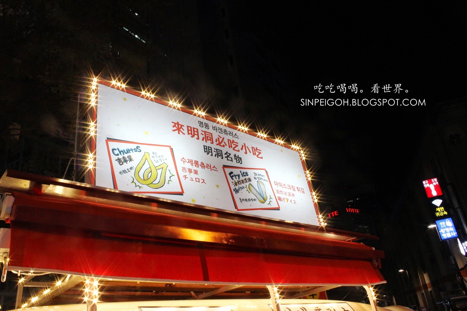 突然看到’來明洞必吃小吃’的招牌,怎麼也要賞一賞臉吧?到底什麼是在明洞必吃的呢?