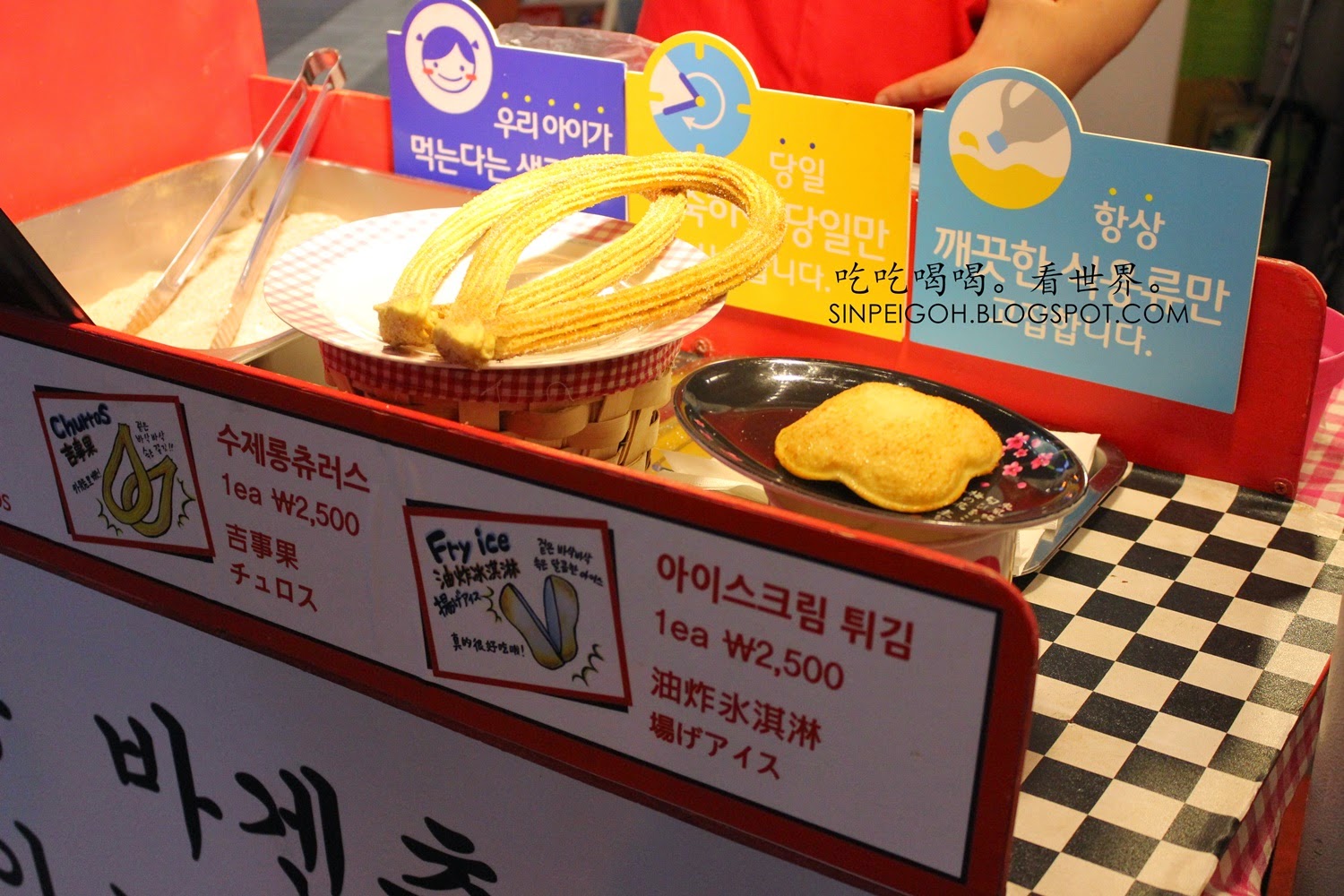 看了看才知道是Churros(吉事果)和油炸冰淇淋,兩樣小吃的價錢都是KWR2500(RM8)。我對油炸冰淇淋沒有太大的興趣,所以只點了一份churros。