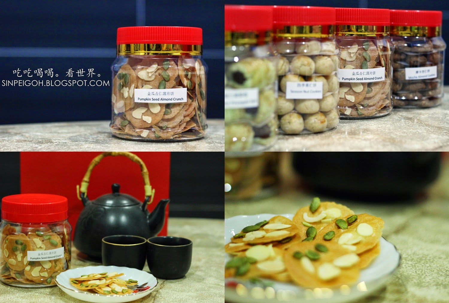 這些就是御林食品的負責人林小姐專門為我挑選適合我口味的年餅,分別是:娘惹式班蘭黃梨卷、摩卡杏仁餅、四季果仁餅以及金瓜杏仁薄片餅。