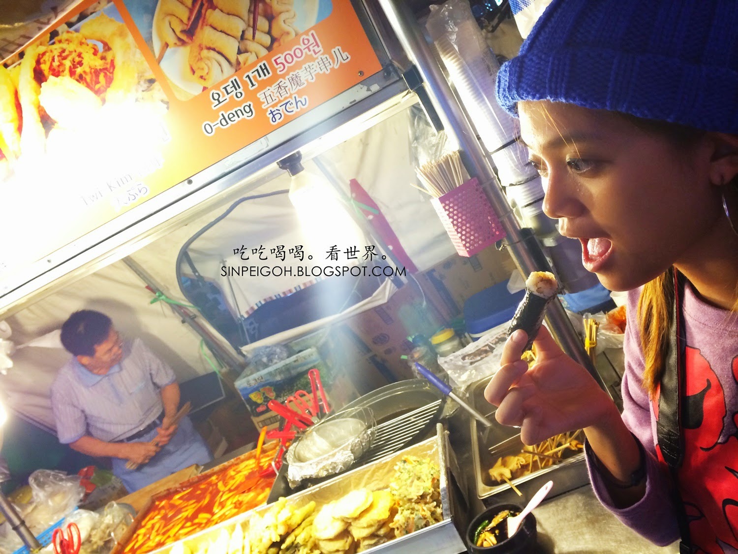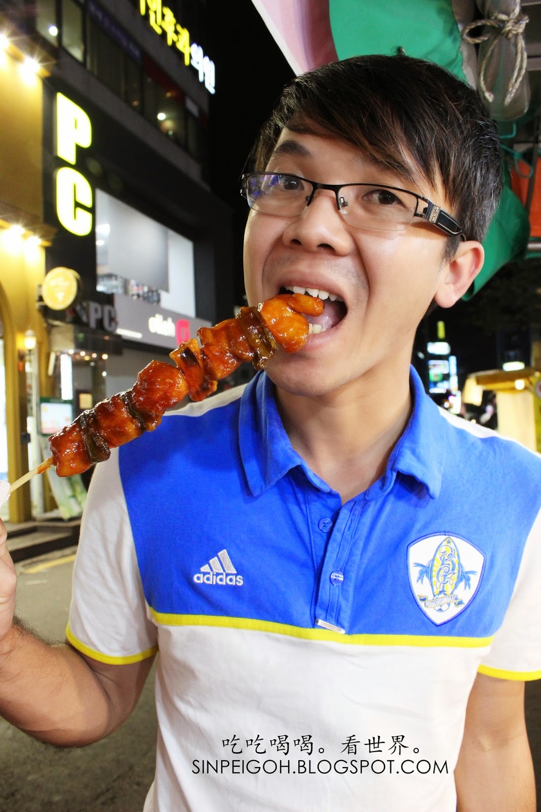 弘大是大學區,所以晚上真的好熱鬧,到處都是年輕人,商店都超好逛!我們倆當然又是被小吃吸引,先來個烤肉串吧!呵呵:D
