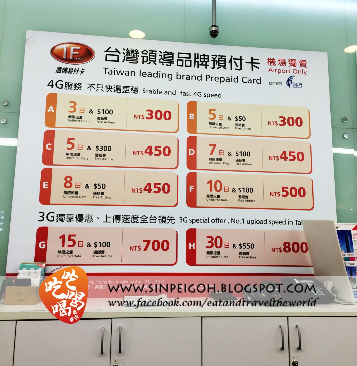 一到機場我們先和家人的租車司機會面,第一天我們是全部人一起住同一家酒店,所以會由兩輛車來載我們離開。在這之前,我們先在機場辦理手機電話卡的配套。在機場有三家公司,配套其實差不多,但由於抵達時間已晚,很多配套已經沒了,最後選擇了遠傳的C配套:5日無線上網+300元通話費,售價450台幣。