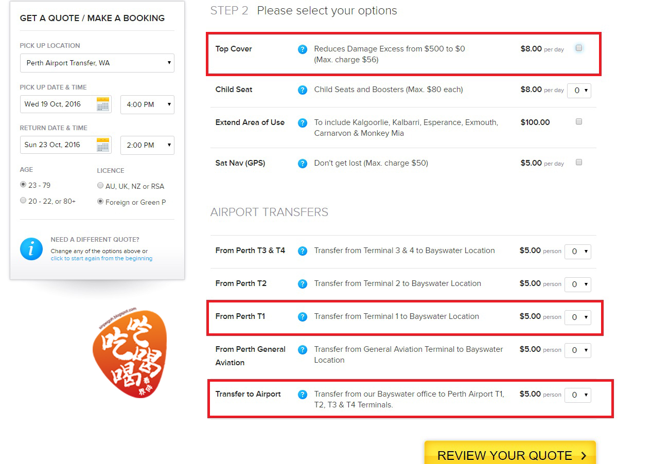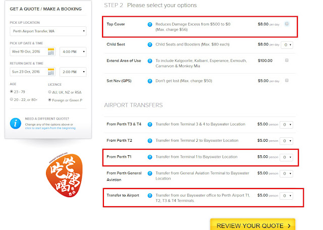首先,選擇Pick up location。由於我們都是在機場下機,當然選擇了Perth Airport Transfer,然後再選擇租車日期和時間。年齡相信大家都會選吧,駕照只需放Foreign(國外駕照)。