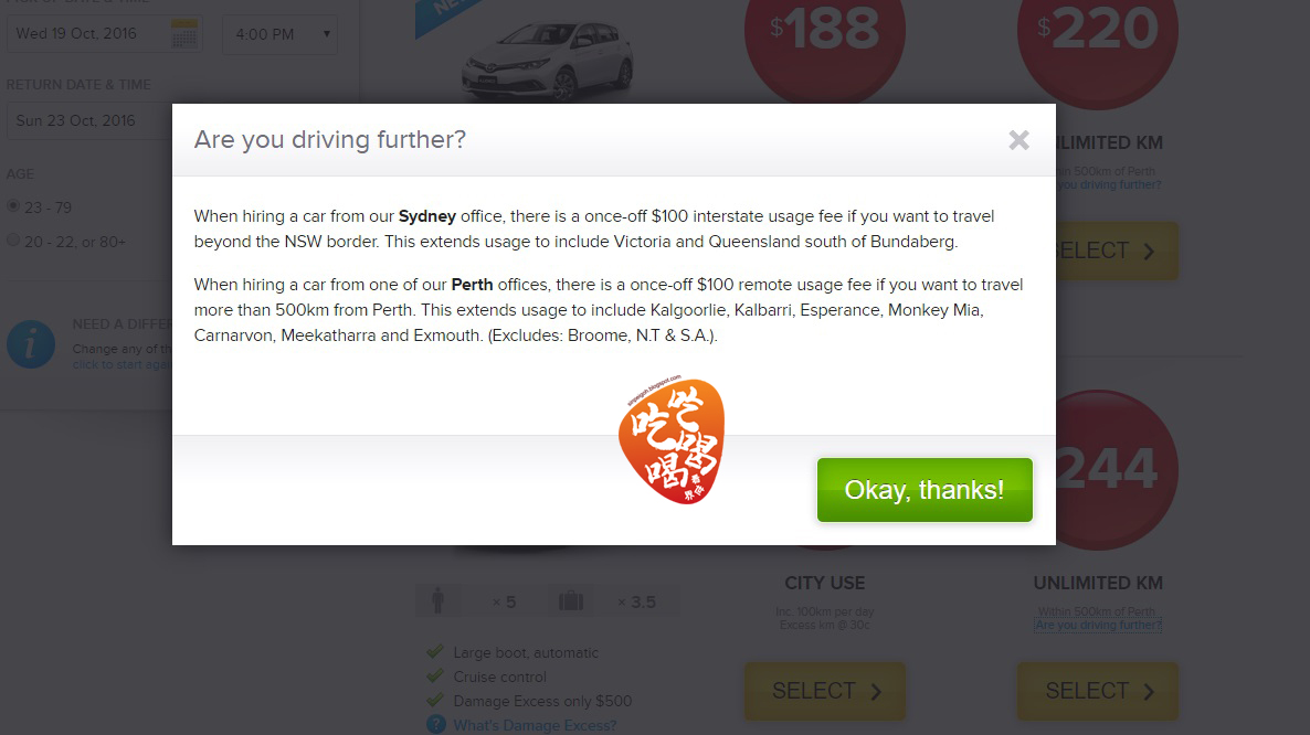 加了$100可以驾到蓝色地区(看图)也就是500km from Perth的意思。