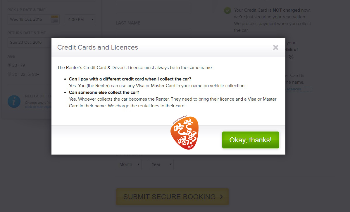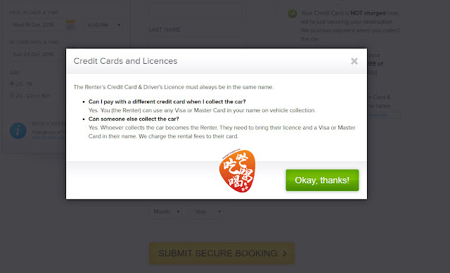 填好資料後會來到這個頁面,把基本的聯絡和信用卡資料填妥後就可以了。信用卡只是保障租車預約,並不會當場被刷,需要到了拿車的那一天才會過帳。所以呢,我們隨時都可以取消或是更改訂單,非常方便!哦,記得要帶著信用卡一起到澳洲去哦〜