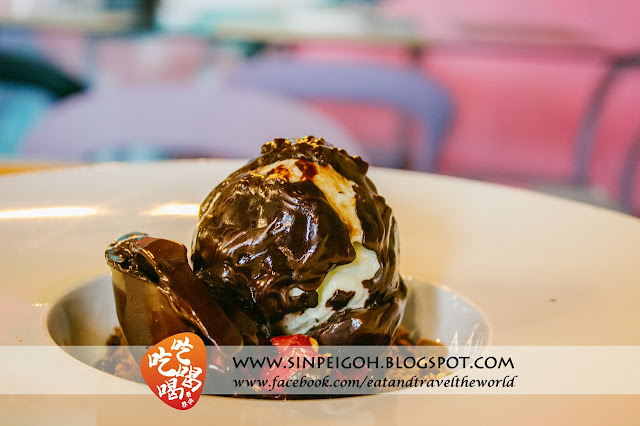 被火燒鍋的巧克力球,裡面有香草雪糕、草莓和nuts哦❤