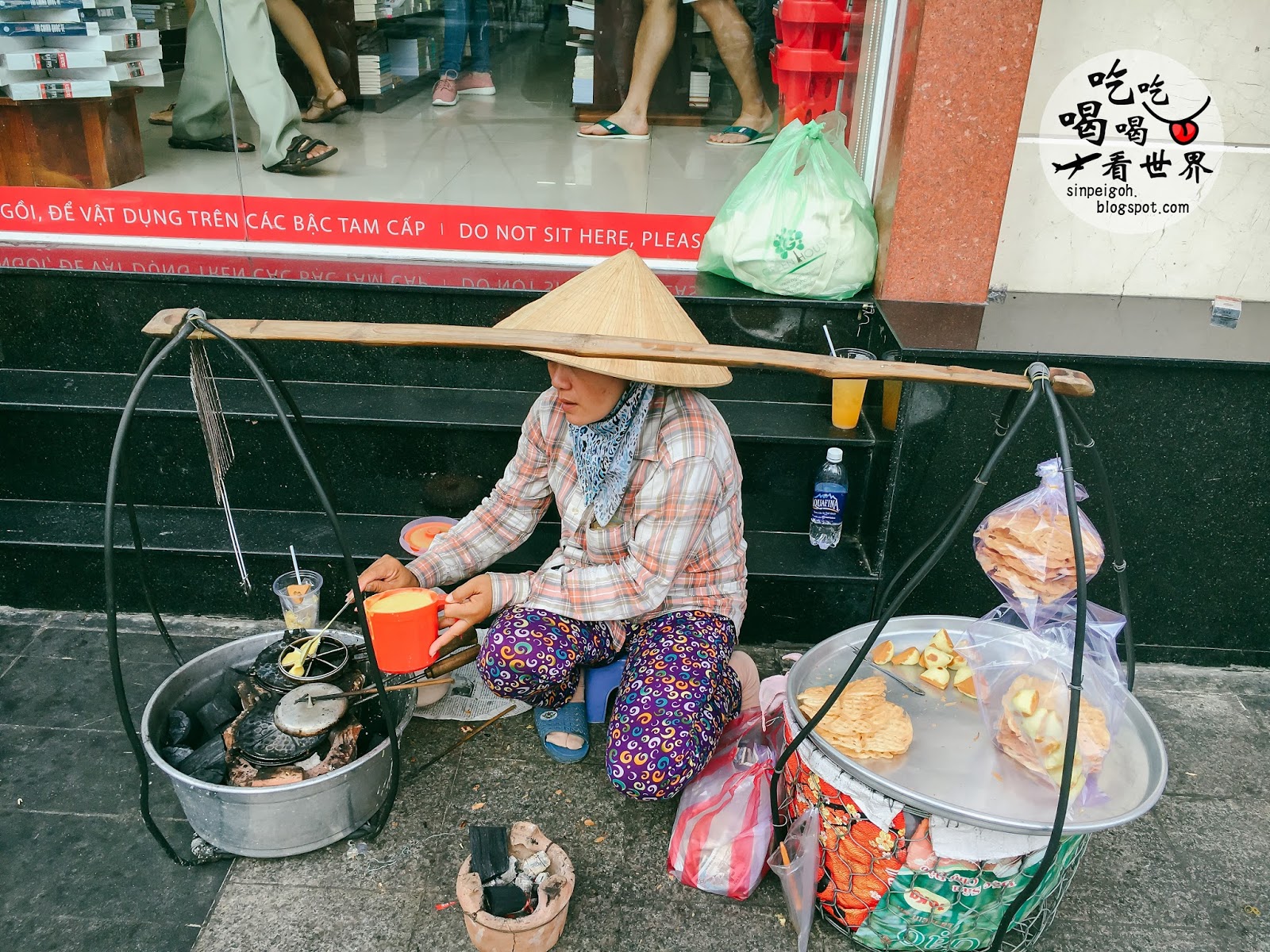 婦人帶著傳統的越南帽子,扛著售賣的小吃就在路邊擺檔。