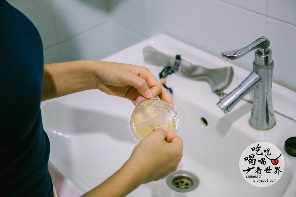 在凝磚上滴上適量水,然後輕揉至起泡,