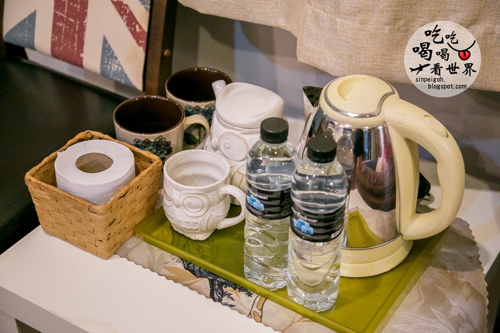 吹風機、熱水壺、礦泉水,一樣都不少。
