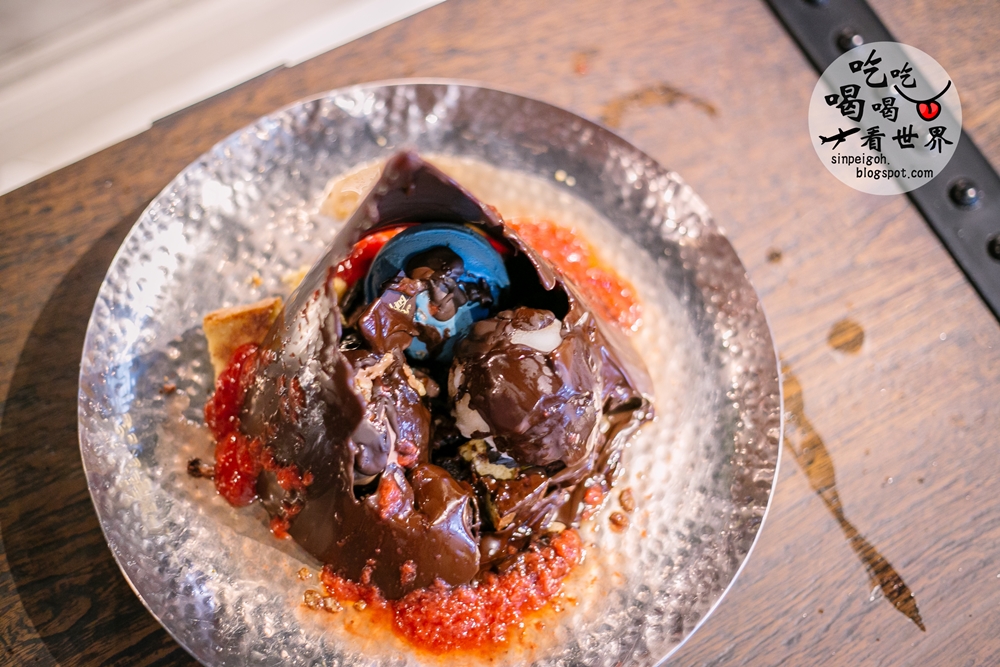 首先,服務生會把Raspberry sauce倒在三角黑巧克力殼上。