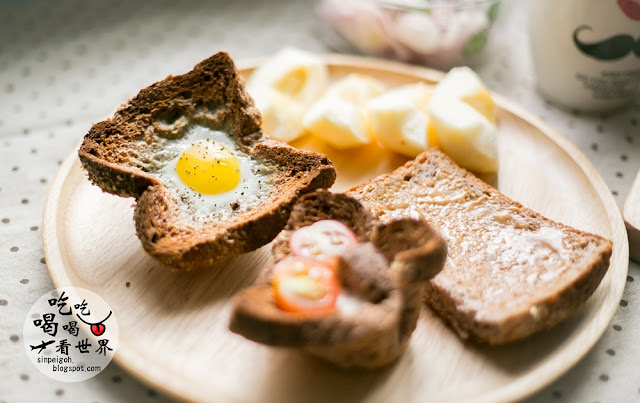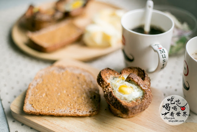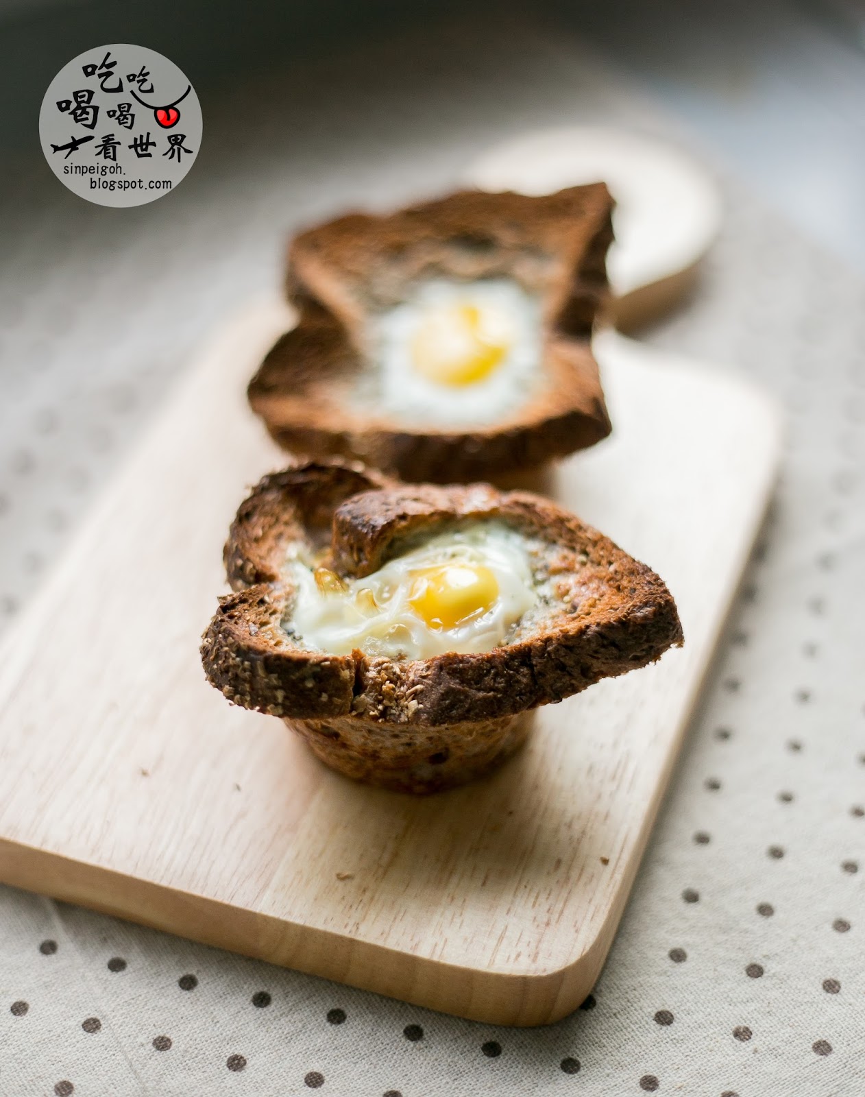 第一次做吐司杯子是以「鹹食」為主,把雞蛋放入吐司杯子一起烤,