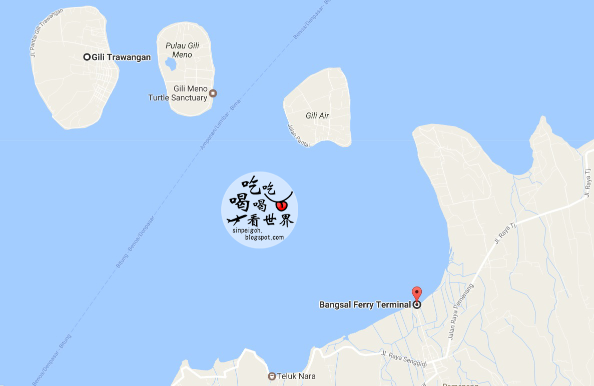 來往龍目島和吉利島的交通肯定就是船啦〜上圖顯示的Bangsal碼頭是一般的公共碼頭,而Teluk Nara是私人快艇碼頭。公共船的好處是票價超便宜,但需要等船滿人才會開船,而且你可能會和雞啊菜啊一起過島(司機說的,我不清楚 ><)私人快艇的票價雖然較貴,但不需要浪費時間,又可以坐得舒服。多人的話當然建議搭快艇,我們是直接和酒店訂了接機服務,所以單單的票價不是很清楚。