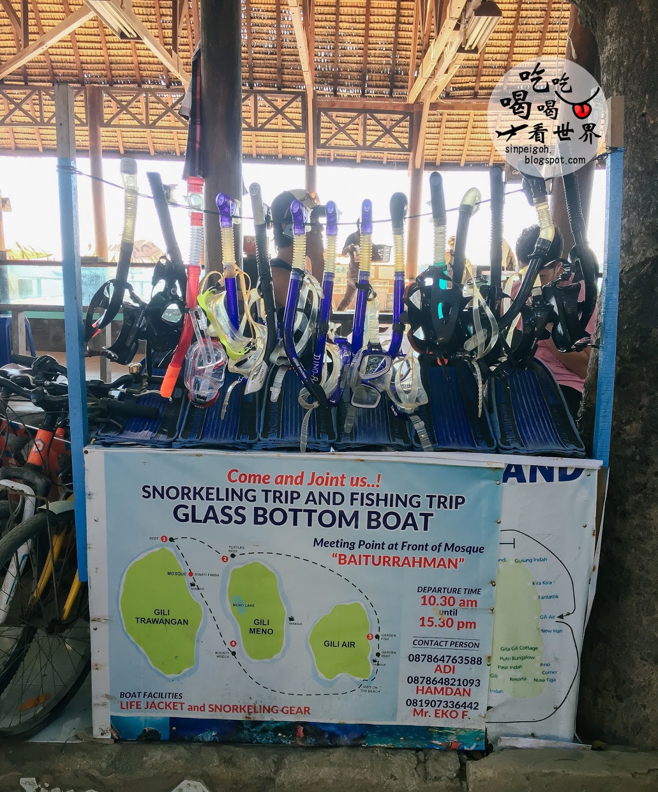 休息完畢後我們便出去找隔天的浮淺配套。這裡的價格差不多都一樣的,5小時浮淺配套一人IDR100,000,包含了救生衣和浮淺面罩,會有四個浮淺地點,中途會到Gili Air吃午餐(自費)。這樣的Public boat會有大概20-30人一起出海,我們最後選擇了私人團,一人的價格是IDR200,000,雖然貴了一倍但船上就只有我們7人,很爽!
