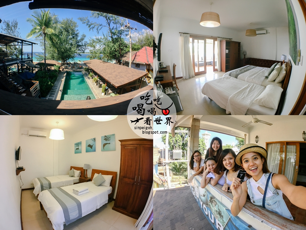 Cheers~~~! 我們入住的酒店就是Trawangan Dive啦〜我們有七人,訂了一間雙人房和家庭房Villa。辦理好入房手續,我們就可以去休息咯。