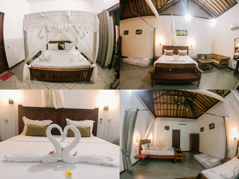 結束了出海之旅,我們真的累壞了,再次坐兩小時的車程去酒店。我們在龍目島的酒店是位於Senggigi的Joje Bungalow。一樣是訂了一間家庭房外加一個床位,還有一間雙人房。房間很大很舒服,很有渡假的氣息,還有浪漫的天鵝毛巾,好適合蜜月啊❤