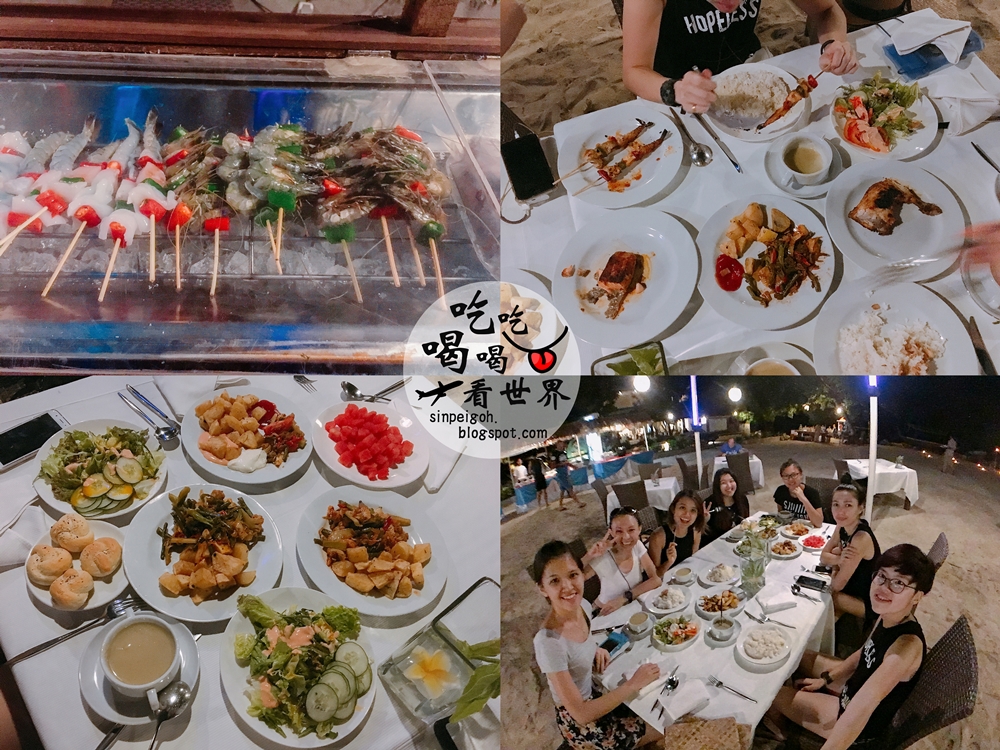 太陽下山拍完照,大家都餓扁了!!懶惰再找就直接在Ombak Sunset看海吃晚餐〜大家可以從菜單選出自己喜歡的燒烤主食,然後旁邊的自助餐能任拿,包括了湯、沙拉、蔬菜、馬鈴薯、飯、水果等等。飲料需要自點,沒有包含。
